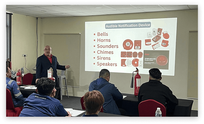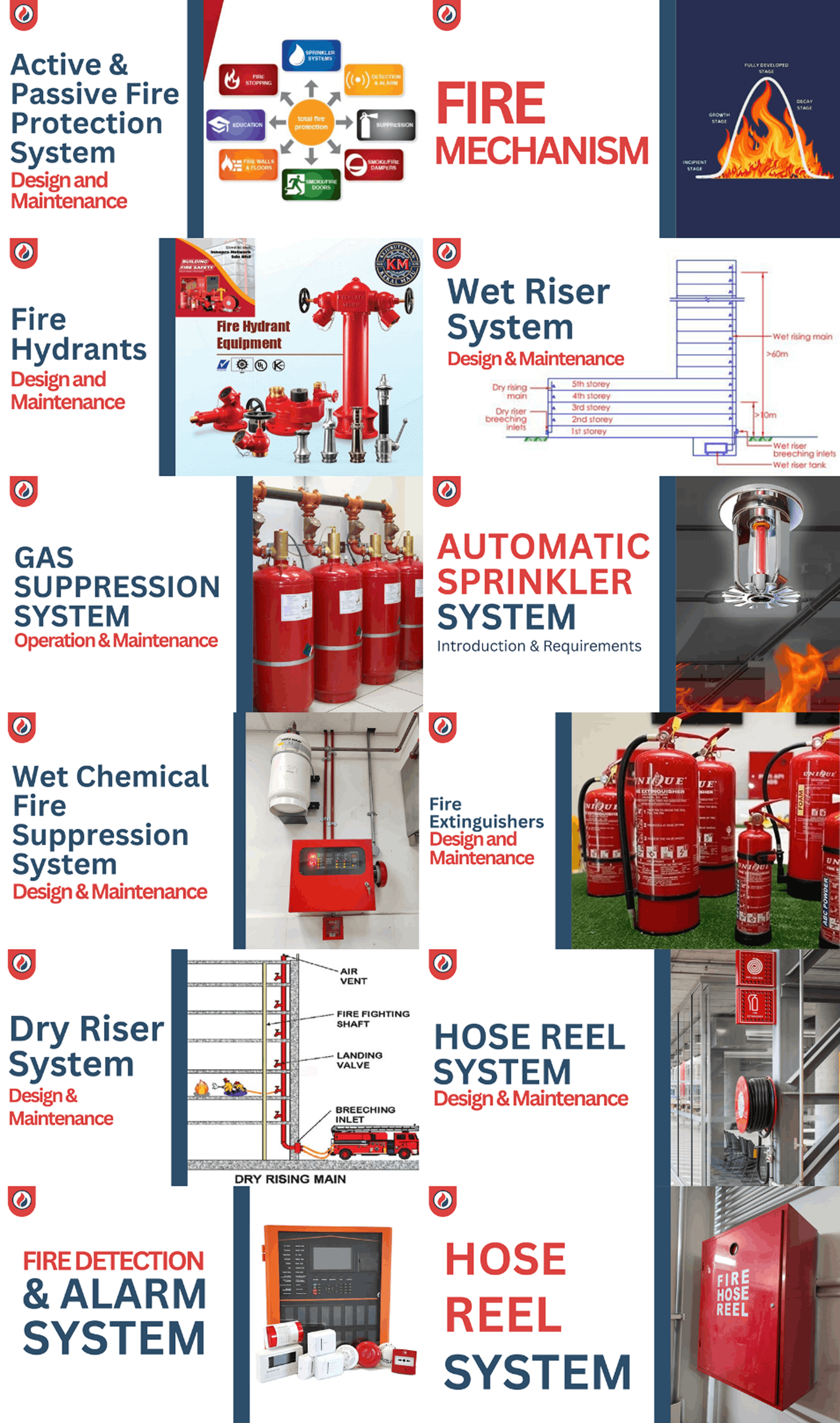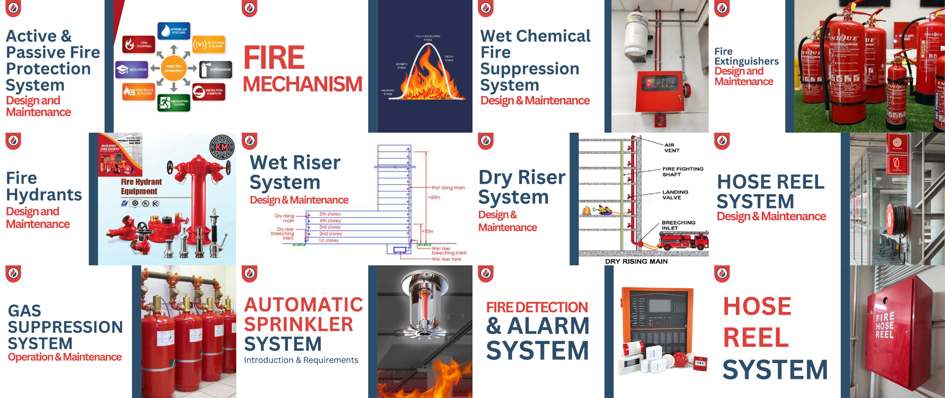 Anda akan didedahkan kepada 12 sistem pencegahan kebakaran bangunan, termasuk kefahaman bagaimana setiap sistem saling berhubung sebagai satu rangkaian keselamatan.